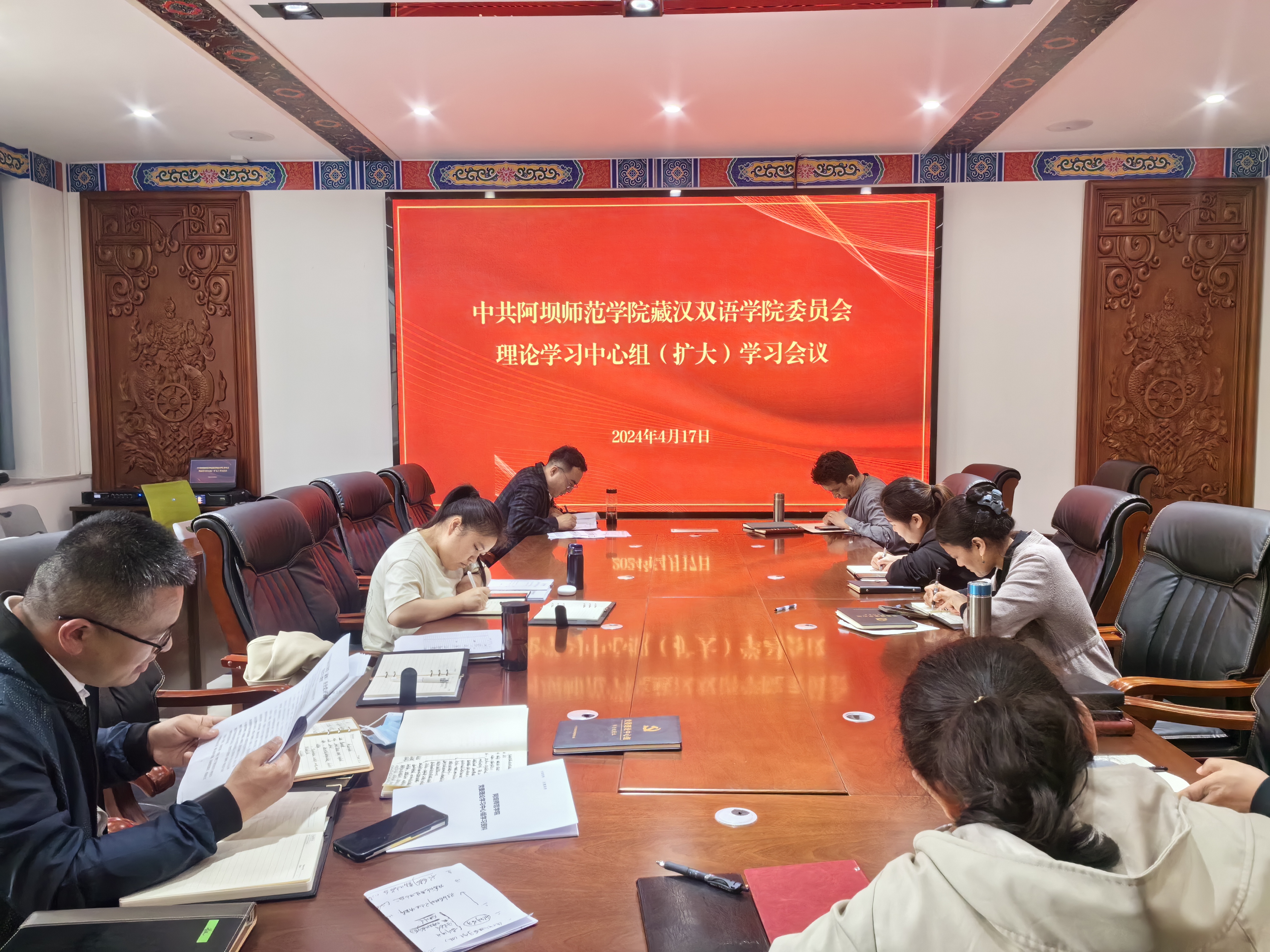 【本网讯】2024年4月17日下午16:00,藏汉双语学院在树人楼F205会议室召开2024年党委理论学习中心组第二次学习会。学院全体党委委员参加,支部(副)书记、纪检委员列席会议。会议由学院党委书记、院长查旺斯基主持。